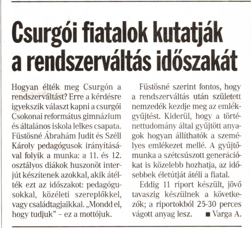 Csurgói diákok készítenek riportokat a rendszerváltás időszakáról tanáraikkal, ismerőseikkel. A munkát Széll Károly és Füstösné Ábrahám Judit tanárok irányítják.
