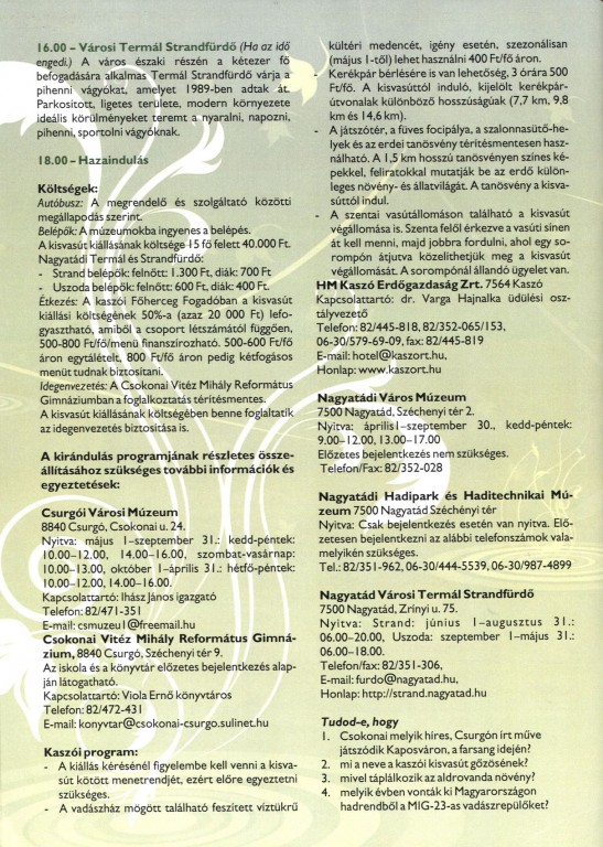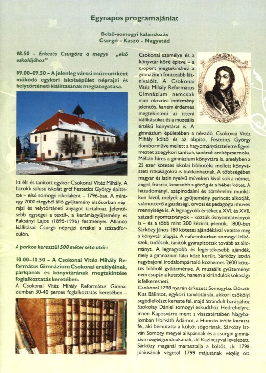 Iskolai kirándulások programajánlójában szerepel a csurgói gimnázium értékeivel, könyvtárával.