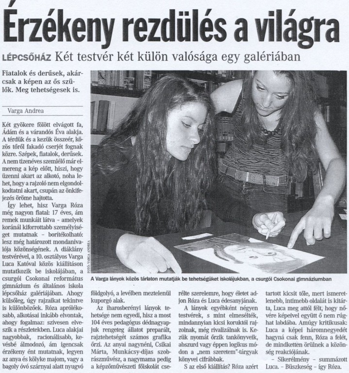Varga Róza és Varga Luca Kató, iskolánk diákjainak bemutatásával foglalkozik a szerző írása. A közelmúltban lett megnyitva a két kislány rajzainak kiállítása, mely a tehetségükről ad bizonyságot.