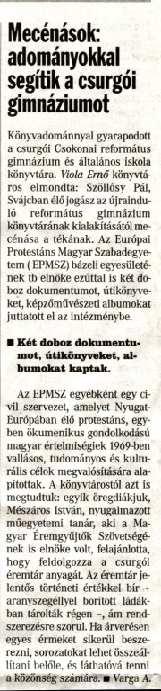 Szöllősy Pál, az Európai Protestáns Magyar Szabadegyetem tiszteletbeli elnöke újabb könyvajándékokkal kápráztatta el iskolánk könyvtárát. Mészáros István nyugalmazott egyetemi tanár vállalta az éremtár feldolgozását.