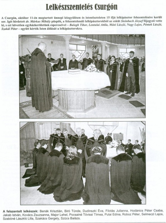 Csurgón, október 11-én megtartott ünnepi közgyűlésen és istentiszteleten 15 ifjú lelkipásztor felszentelésére került sor. Forrás DUNÁNTÚLI REFORMÁTUS LAP Megjelenés dátuma 2007. 12. 04. Rögzítés dátuma 2011. 05. 24.