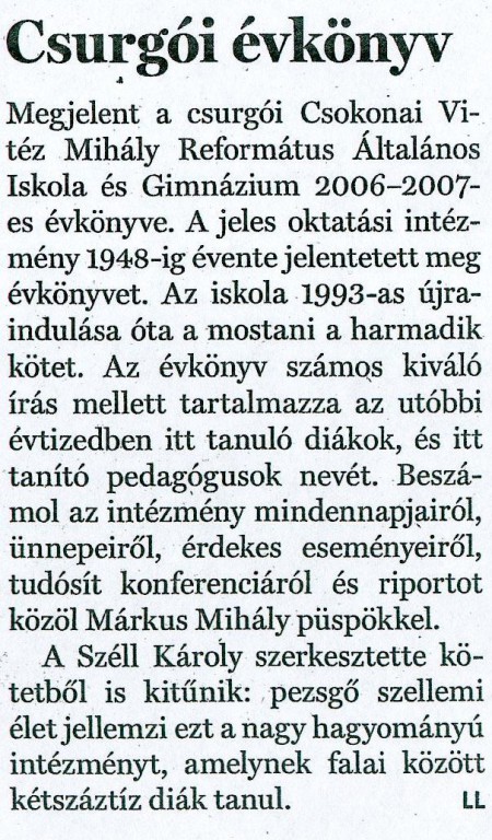 Gimnázium 2006-2007-es évkönyve. Az iskola 1993-as újraindulása óta a mostani a harmadik kötet.
