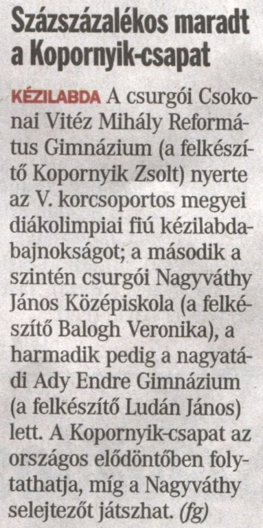 A csurgói Református Gimnázium nyerte az V. korcsoportos megyei diákolimpiai fiú kézilabda bajnokságot.