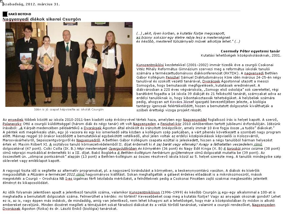Idén is kitettek magukért a távoli Nagyenyedről érkezett kutató diákok a Csokonai református gimnáziumban rendezett Református Középiskolák Tudományos Diákköri Konferenciáján.