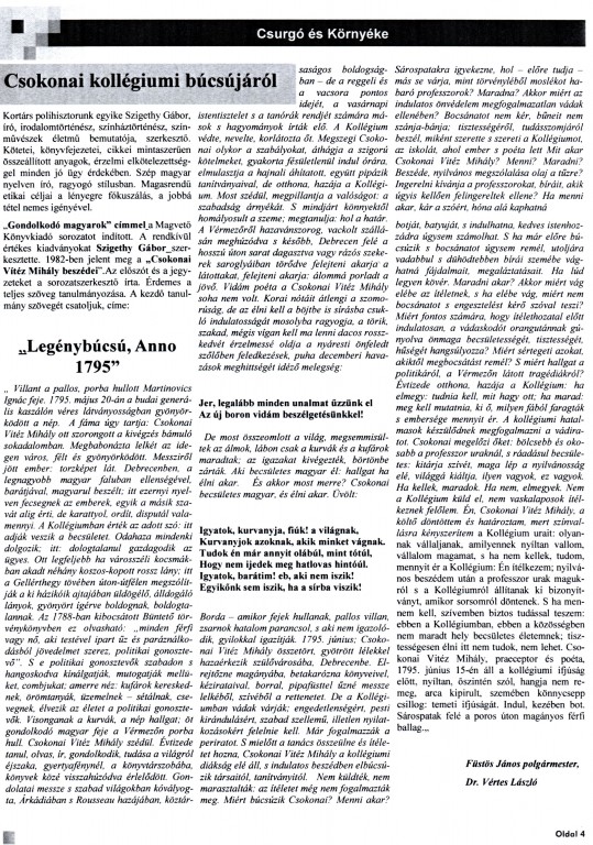 Iskolánk egykori tanáráról, Csokonai Vitéz Mihályról a "Gondolkodó Magyarok" sorozatban kötet jelent meg, "Csokonai Vitéz Mihály beszédei" címmel. A könyv kezdő tanulmányából olvashatunk helyi lapunkban.