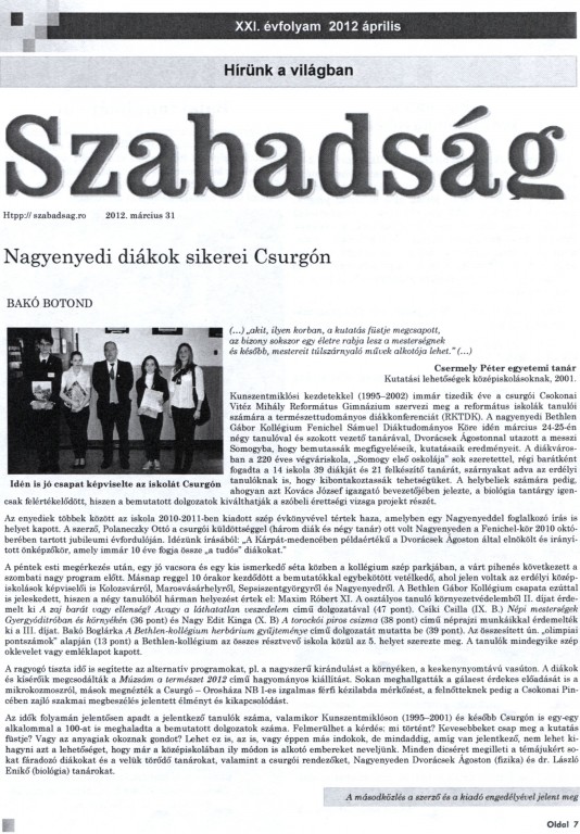 A nagyenyedi Bethlen Gábor Kollégium diákjai jól szerepeltek az RKTDK-n Csurgón. Forrás Csurgó és Környéke Szerző Bakó Botond Megjelenés dátuma 2012. 04. 20. Rögzítés dátuma 2012. 05. 07.