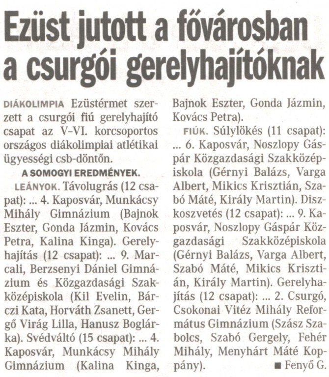 Ezüstérmes lett a Csokonai Gimnázium gerelyhajító csapata az országos versenyen. Forrás Somogyi Hírlap Szerző Fenyő G. Megjelenés dátuma 2012. 11. 05. Rögzítés dátuma 2012. 11. 08.