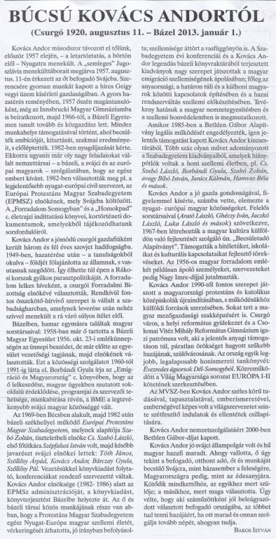 Kovács Andor iskolánk öregdiákjától búcsúzik a külföldi magyarság nevében a Bécsi Napló egy írása.