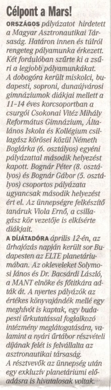 Országos pályázaton nyert második helyezést iskolánk három tanulója csillagászatból. Németh Boglárka (6. osztály), Bognár Péter (8. osztály)és Bognár Gábor (5. osztály)öregbítette iskolánk hírnevét a szép eredménnyel.