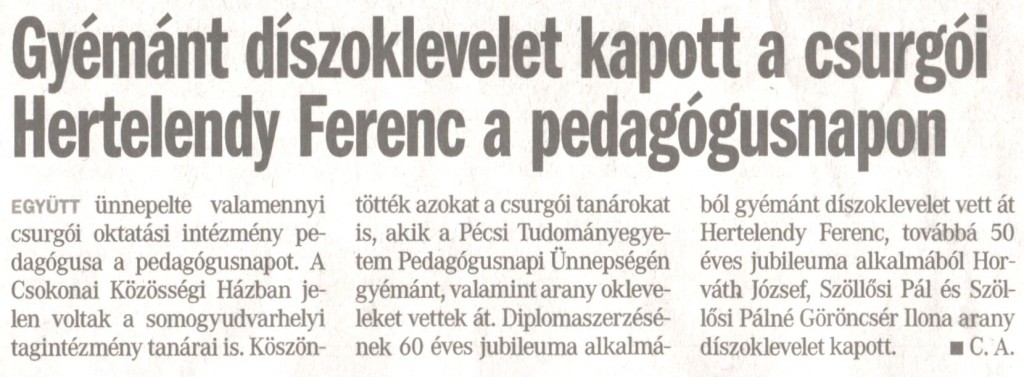 Díszoklevelet kaptak iskolánk egykori tanárai a pedagógusnap alkalmából. Forrás Somogyi Hírlap Szerző C.A. Megjelenés dátuma 2013. 06. 08. Rögzítés dátuma 2013. 06. 10.