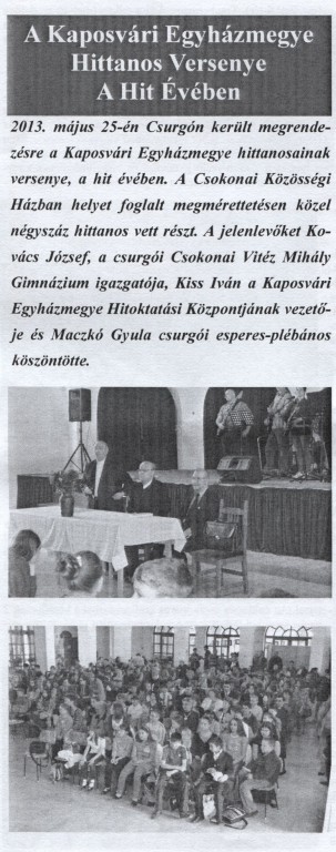 2013. május 25-én Csurgón került megrendezésre a Kaposvári Egyházmegye Hittanosainak versenye a Hit évében.